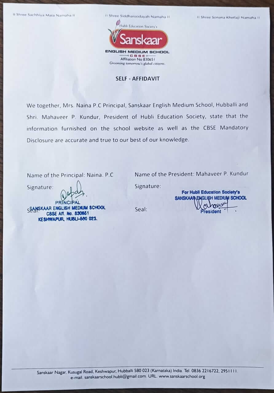 | 6. | SCHOOL EMAIL ID | admin@sanskaarhubli.edu.in principalsanskaarhubli.edu.in |